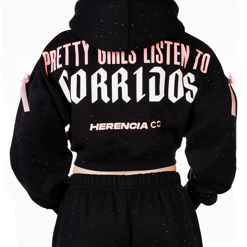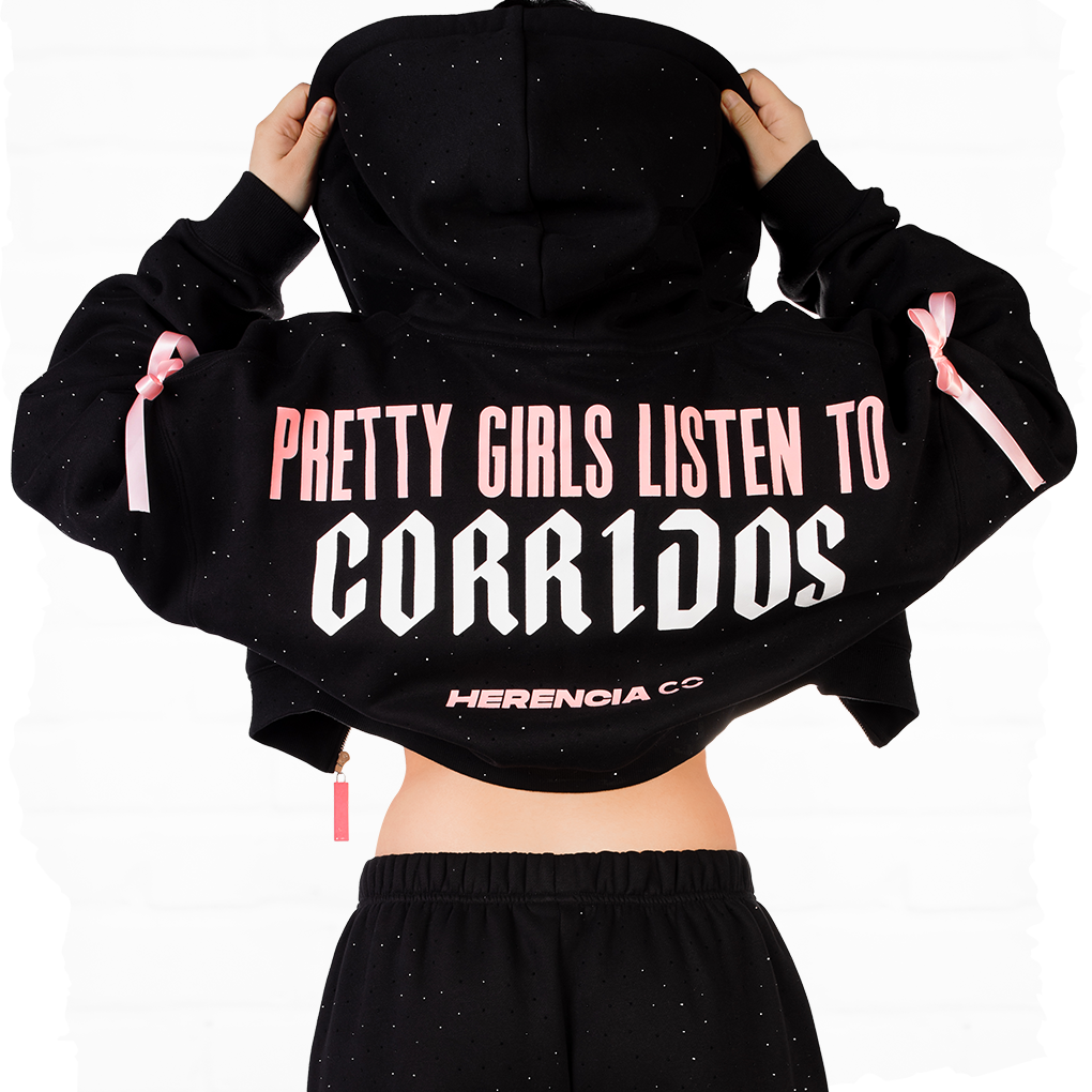 Pretty Girls Listen To Corridos Zip Up Crop Rhinestone Hoodie